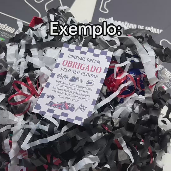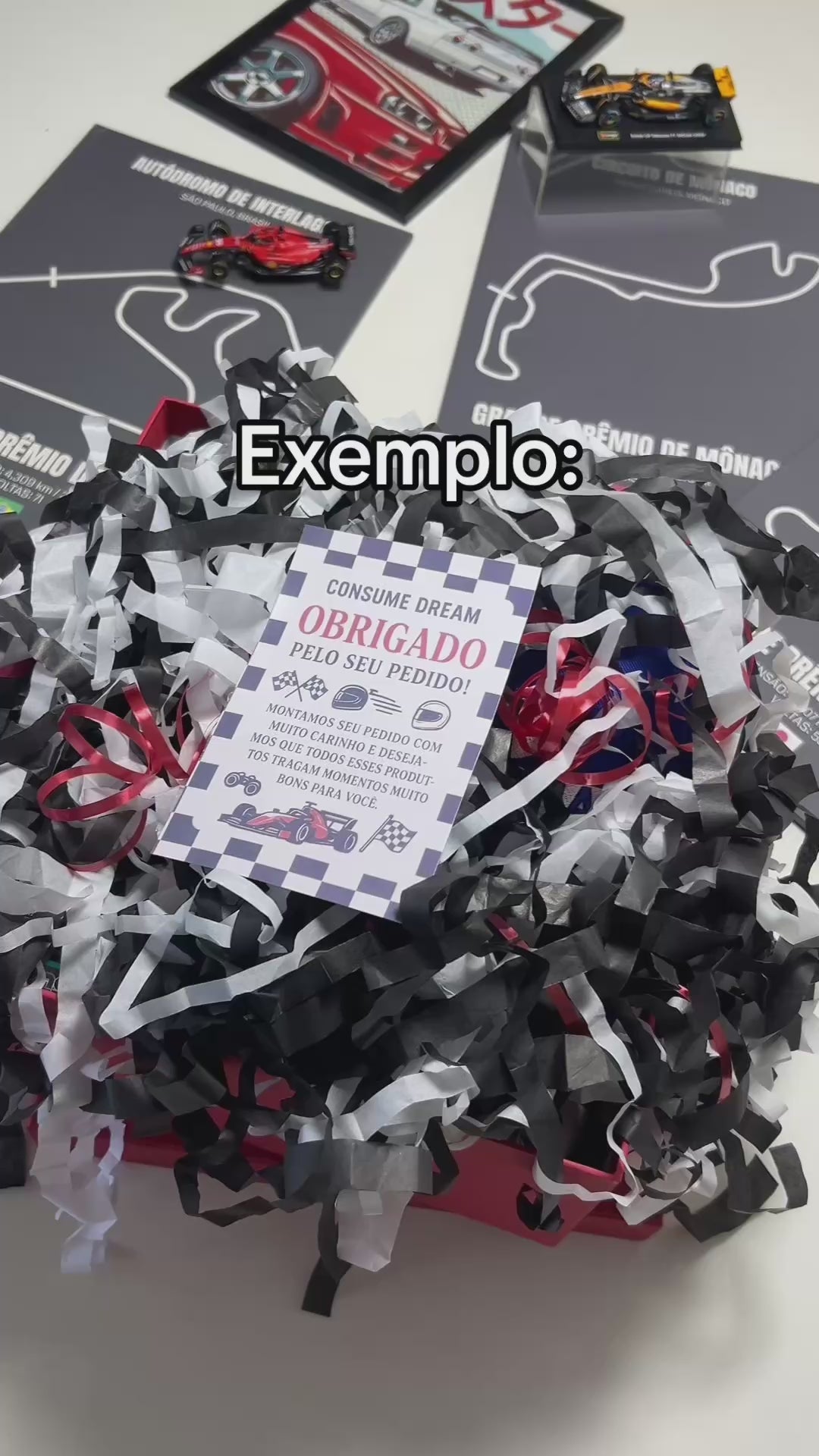 Pode vir: miniaturas de carros, camisetas exclusivas, quadros decorativos, mini capacetes, canecas, garrafas térmicas, bonés, chaveiros colecionáveis, álbuns de fotos e outros produtos especiais e raros.